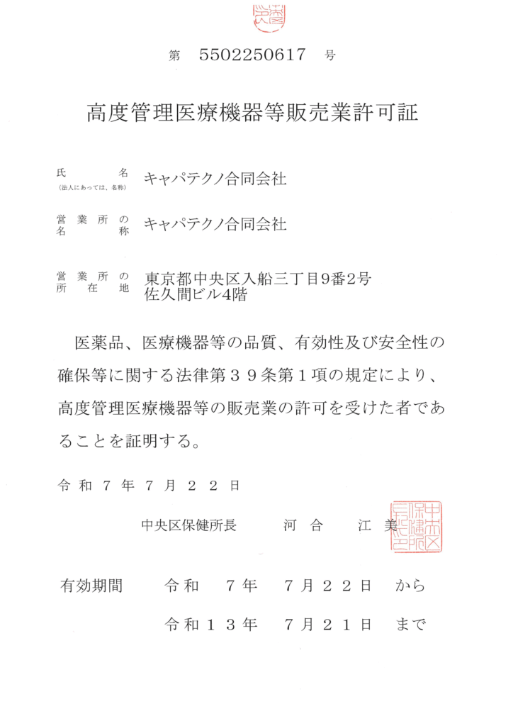 この度、キャパテクノ合同会社は高度管理医療機器等販売業許可証を取得致しました事を、お知らせいたします。